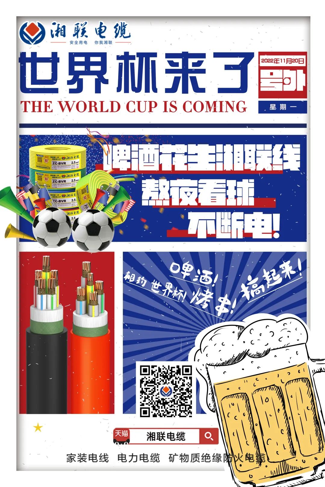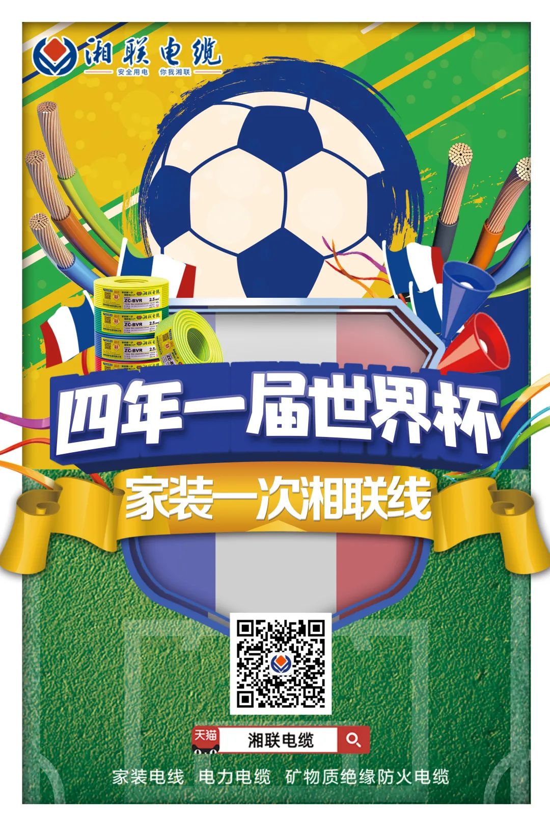 湘聯電纜產品不僅通過國家強制性產品(CCC認證),而且符合ROHS指令,同時,獲得“中國節能環保產品”等榮譽,且由中國人保承保,不懼時間變化,不僅陪伴您本屆世界杯,還可以陪伴您每一屆世界杯。